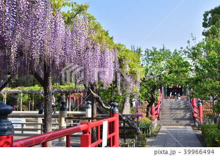 藤の花が咲く亀戸天神社の境内とスカイツリー