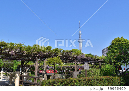 藤の花が咲く亀戸天神社の境内とスカイツリー