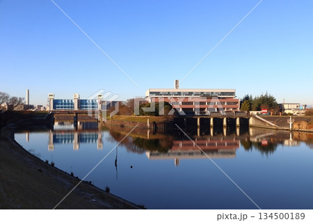 冬の新芝川排水機場と芝川水門(埼玉県川口市)