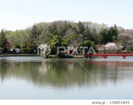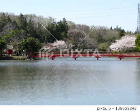 春を迎えた大沼公園の弁天橋 ほぼ全景(2025.4.9) 穏やかで満開の桜と記念写真一枚