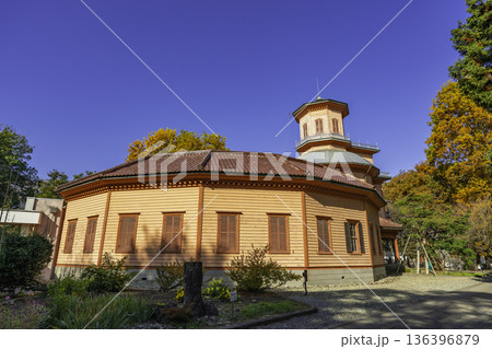 明治の木造西洋館の紅葉を映す窓・郷土館・山形市
