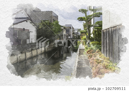 水彩画風 佐賀城下町 柳町の水路 佐賀県佐賀市