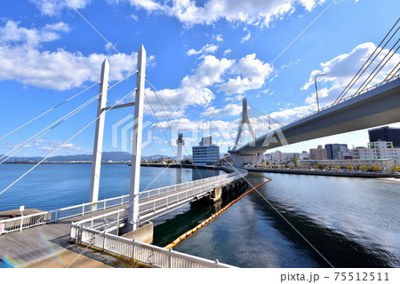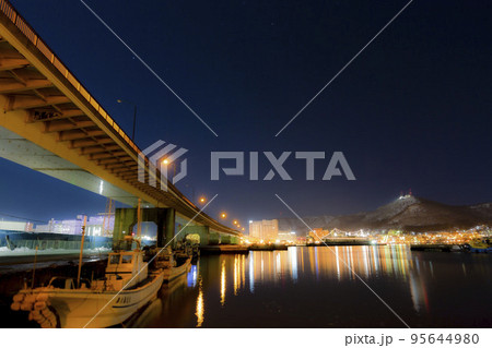 ふ頭船溜まりから函館市の港湾地帯を見る構図 北海道函館市