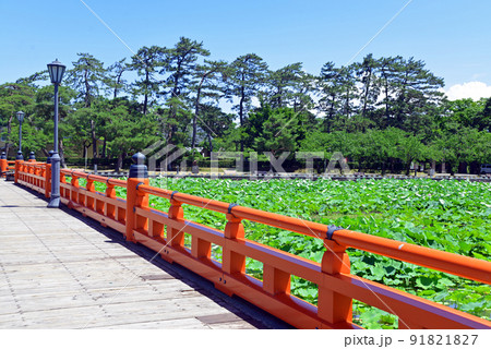 【新潟県上越市】高田城址公園の蓮と外堀の赤い橋