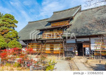 (山梨県)旧高野家住宅(甘草屋敷)、軒先の柿すだれ(枯露柿)