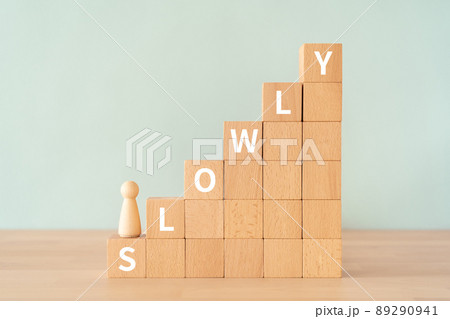 ゆっくりのイメージ|「SLOWLY」と書かれた積み木とコイン