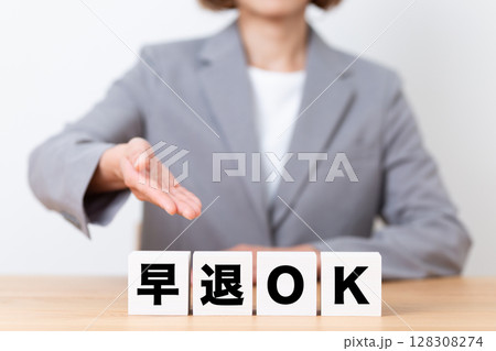 早退OKのブロックとスーツを着たミドル女性ビジネスウーマン
