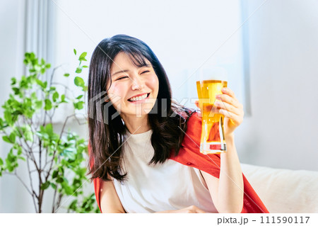 仕事を早上がりして自宅の部屋でアフターファイブを楽しむためにビールを飲んで味わう笑顔の30代の女性