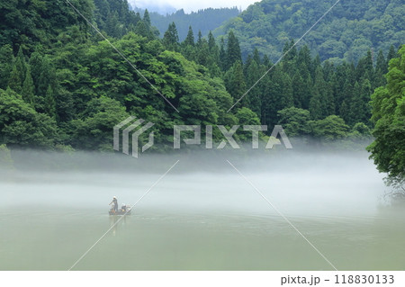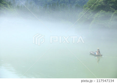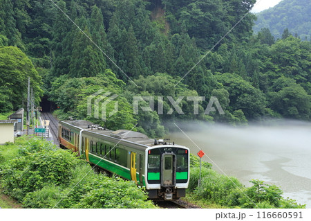 只見線「早戸駅とE120系2両編成」只見川の川霧背景に