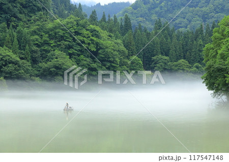 只見線「早戸駅と到着直前の列車」只見川の川霧背景に