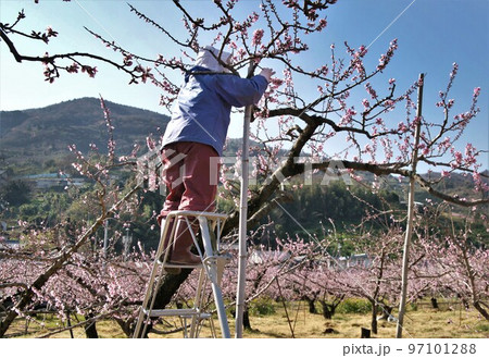 桃の花の摘花作業 桃の花の摘花する農婦の様子