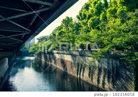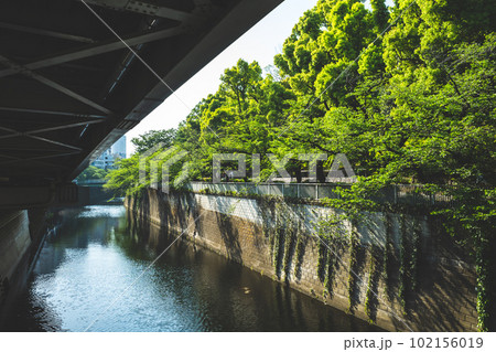 新緑の川辺を走る首都高速 首都高速5号線 早稲田出口 2023.04 マット感