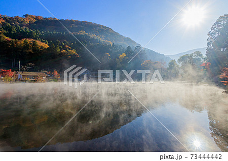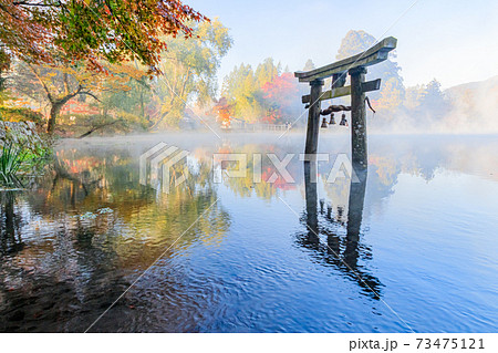 紅葉と早朝の金鱗湖 天祖神社 大分県由布市