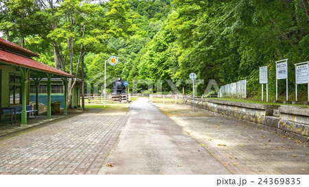 神居古潭(かむいこたん)、旧神居古潭駅の駅舎とSL蒸気機関車(C57、D51)と新緑/北海道旭川市