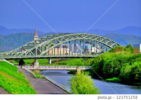 春の相生橋と旭川河川敷の風景 岡山県岡山市北区
