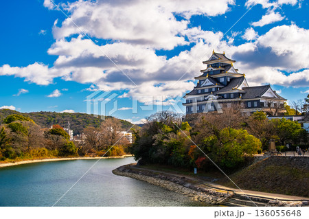 岡山市 青空の下の岡山城天守閣と旭川の風景