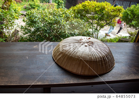 岐阜県 中津川市 馬籠宿 休憩所の窓 三度笠と合羽