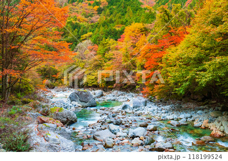東京 紅葉に染まる秋川渓谷 石舟橋