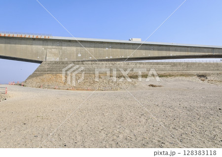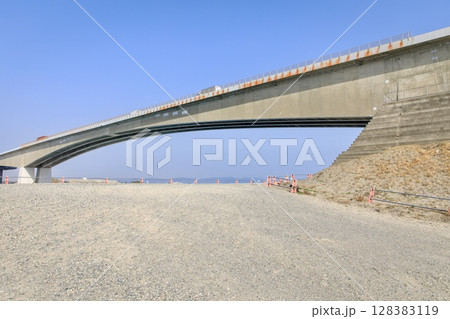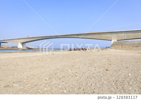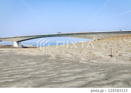 浜松市、今切口の砂浜と浜名大橋