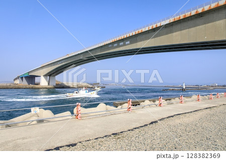 浜松市、浜名湖の今切口と頭上を通る浜名大橋