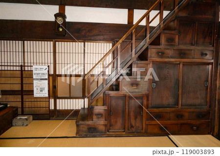岩手県盛岡市の町屋の主人のいる座敷と急な勾配の箱階段