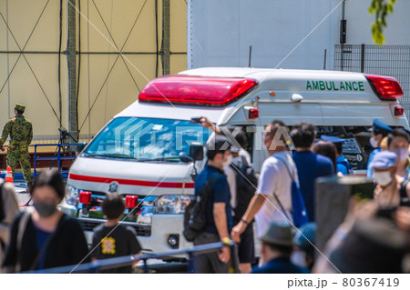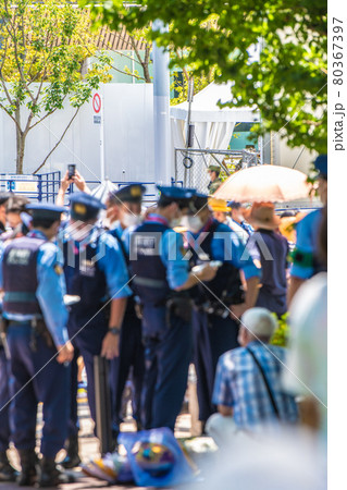 日本の東京都市景観 熱中症で倒れた高齢者…さすが対応が早い日本警察。国立競技場前大混雑…=7月23日