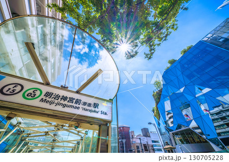 日本の東京都市景観 東京・表参道の緑溢れる並木や明治神宮前(原宿)駅、東急プラザ、トミーヒルフィガー