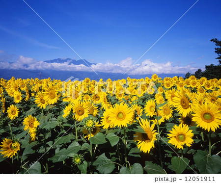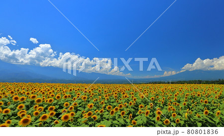 山梨県北杜市明野町 明野サンフラワーフェスの満開のひまわり畑と青空、山々にかかる雲の景色