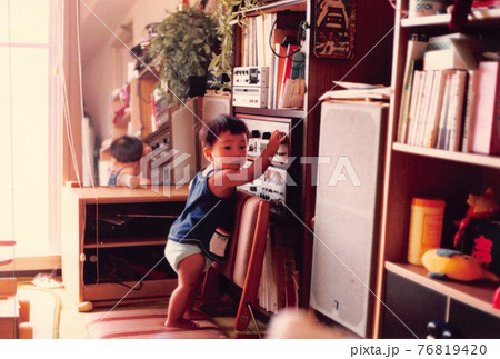 昔のフィルム写真 家の中のレトロなスピーカーで遊ぶ小さな男の子
