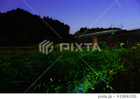 北の星の軌跡と棚田を舞うホタルの軌跡
