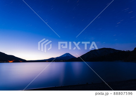 雪を冠る富士山 精進湖から望む 夜景 星の軌跡 山梨県 日本