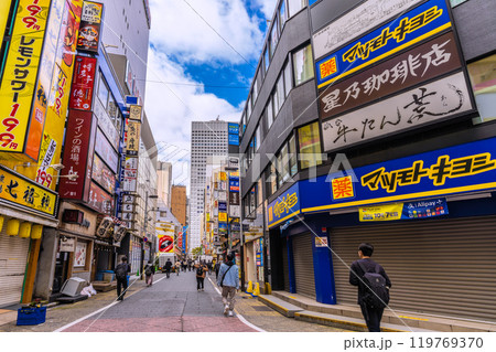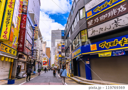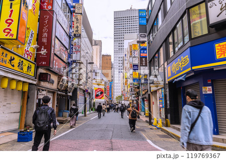 日本の東京都市景観 新宿西口の飲み屋街。奥のオフィス街に出勤する人達…=21日