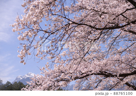 北杜市白州町、満開のサクラと南アルプス甲斐駒ヶ岳