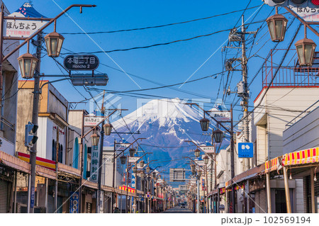 (山梨県)富士吉田市ほんちょう2丁目商店街 後方に雄大な富士山