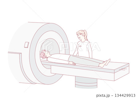 Medical computed tomography or MRI scanner. Doctor examining MRI results, female patient lying on couchette. Doctor wearing glasses, holding MRI results. Concept of modern diagnostics.