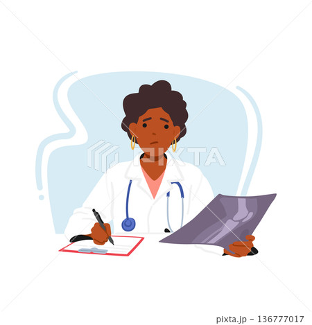 Tired Female Doctor Character Analyzing An X-ray Image At Her Desk, Attentively Writing Notes On A Clipboard