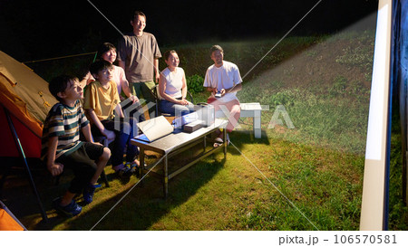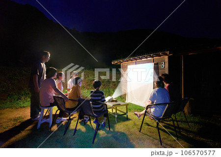 プロジェクターを使ってアウトドアで映画鑑賞をする人々 キャンプ ファミリー イメージ