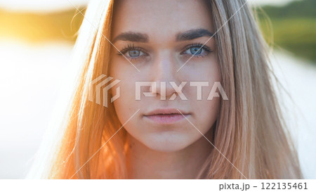Portrait of a blonde teenage girl with blue eyes and a serious expression, enjoying the golden hour light in a natural outdoor setting