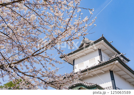 金沢市の兼六園から望む金沢城の春の風景。ソメイヨシノが満開で春のお花見時期には人気の桜の名勝