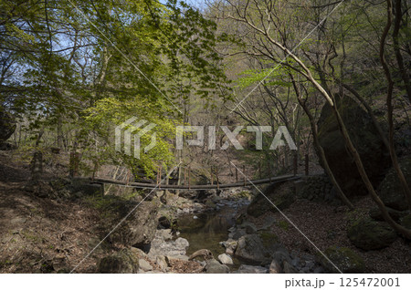 有馬ダム 名栗湖 湖畔 杉林 雑木林 春 新緑の風景