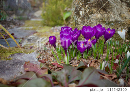 春の目覚め、クロッカスの花盛り、紫の花言葉は「愛の後悔」ギリシア神話のラブストーリーになぞらえて