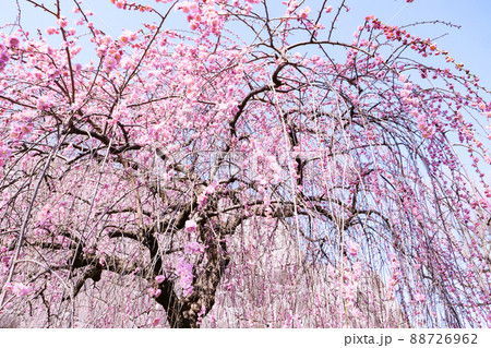 写真、風景、植物、岩手公園の鮮やかな垂れ梅 春風に眩しい垂れ梅