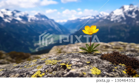vibrant yellow flower blooms rocky surface, surrounded by majestic mountains and clear blue sky