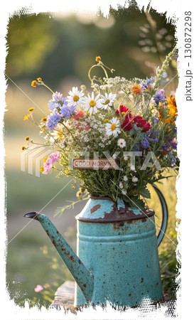 Rustic Wildflowers in a Teapot. An AI-generated image of a colorful wildflower bouquet in a rustic, weathered turquoise teapot. Perfect for morning, spring, and nature themes.