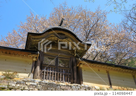 【佐賀県】晴天の小城公園の大角槙と満開の桜
