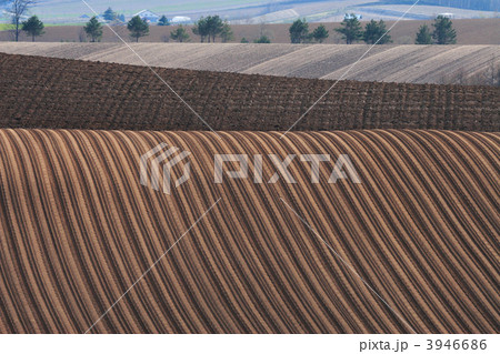 美瑛の遠くの丘から見える牧場の春