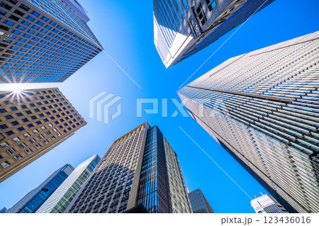 日本の東京都市景観春のような暖かな日差し…「大手町駅前」交差点のからビジネス街を望む…希望の光
