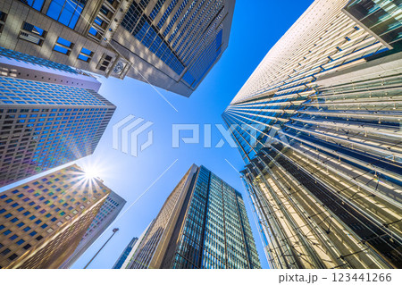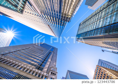 日本の東京都市景観春のような暖かな日差し…「大手町駅前」交差点のからビジネス街を望む…希望の光