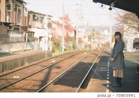 駅のホームで電車を待つ女性