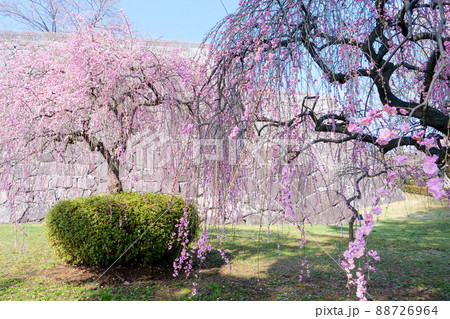 写真、風景、植物 北国盛岡の鮮やかなしだれ梅と石垣 春風に眩しい垂れ梅